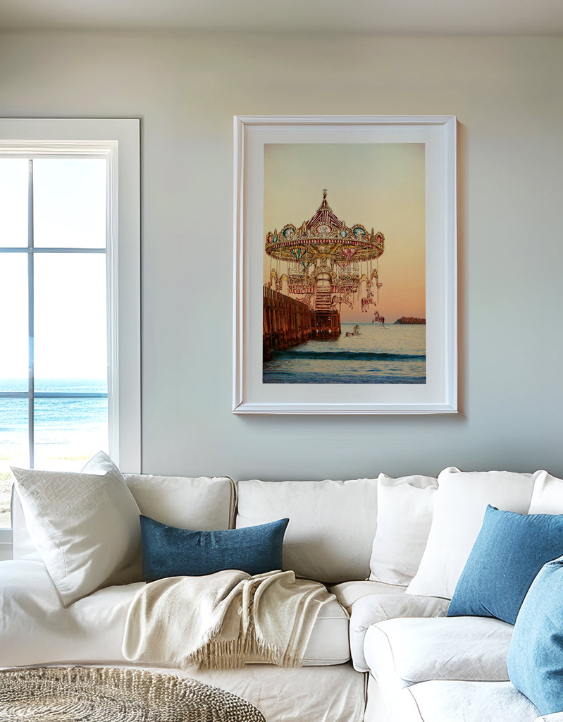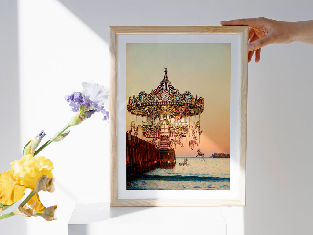 This much loved hand drawn carousel artwork featuring a photo of Coffs Harbour's beloved Jetty at dusk, where whimsical horses come to life jumping free into the ocean after a long day is still an Alykat favourite and best seller.
